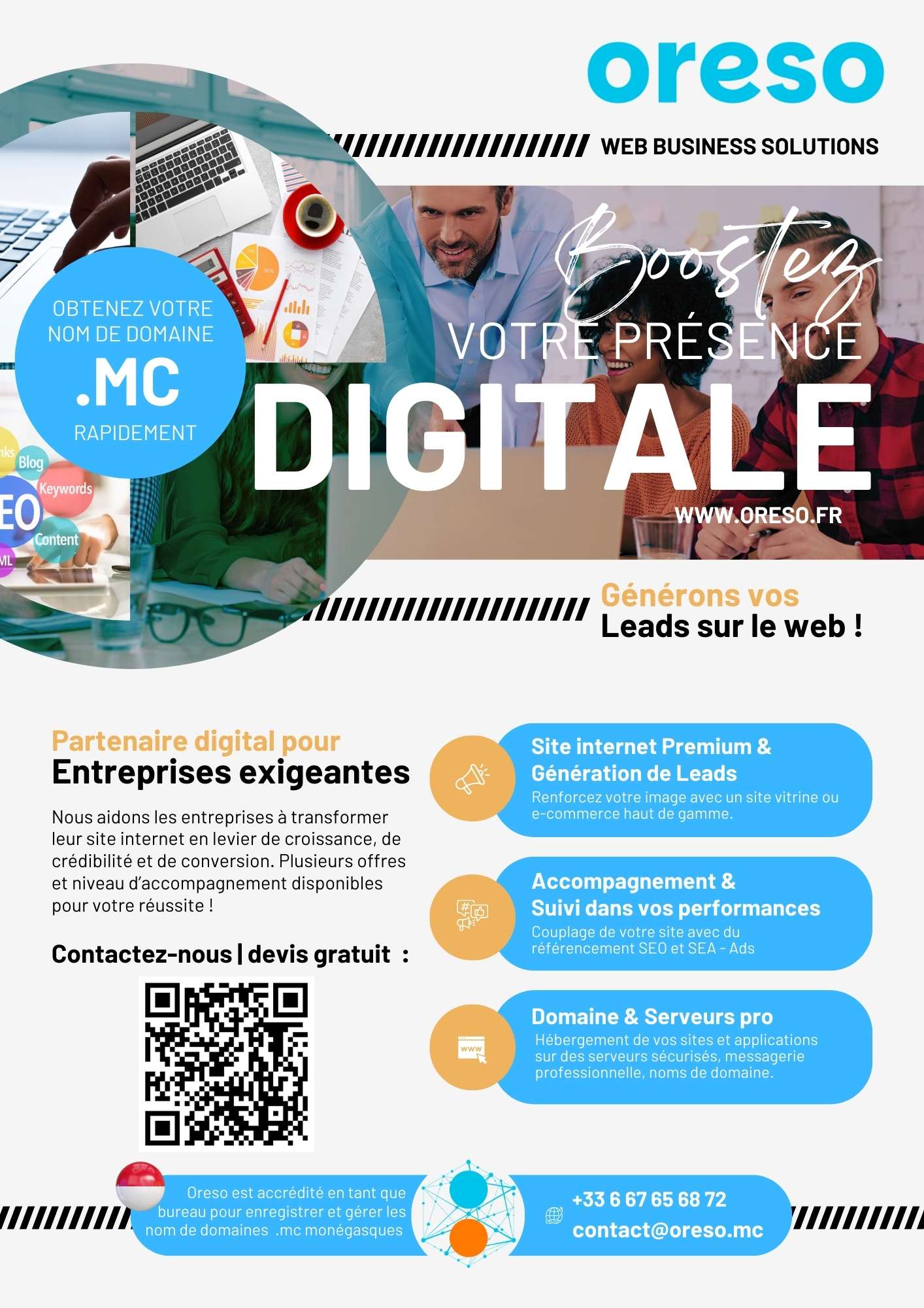 Vous venez de créer, ou vous avez déjà une entreprise en principauté de Monaco? Vous pouvez alors obtenir un nom de domaine en ".mc" au nom de votre société. Pour cela vous devez faire appel à un bureau d'enregistrement accrédité. ORESO est certifié auprès de la Direction des Plateformes et des Ressources Numériques de Monaco, pour créer votre nom de domaine .mc ! Nous pouvons également créer votre charte graphique, site web, hébergement... Contactez-nous pour plus d'informations.